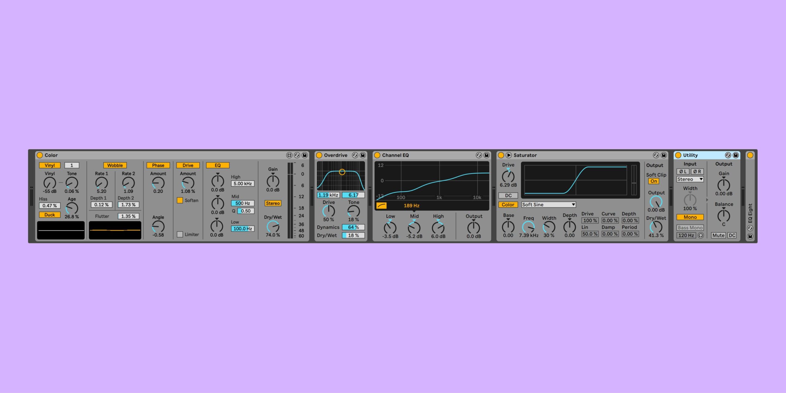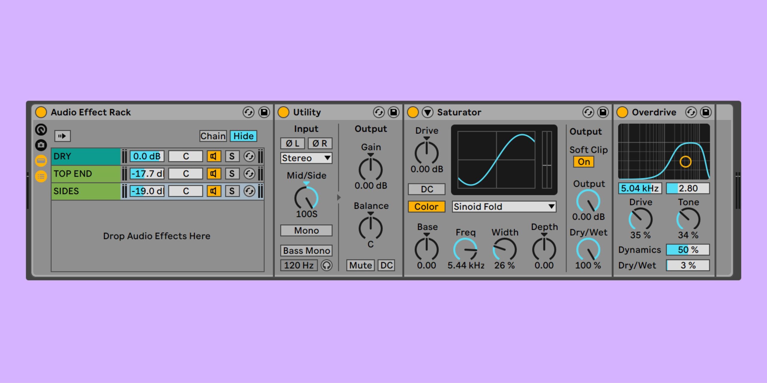 In the third chain, I’ve toggled a Utility device to Mid/Side mode. This allowed me to add saturation and overdrive just to the sides.